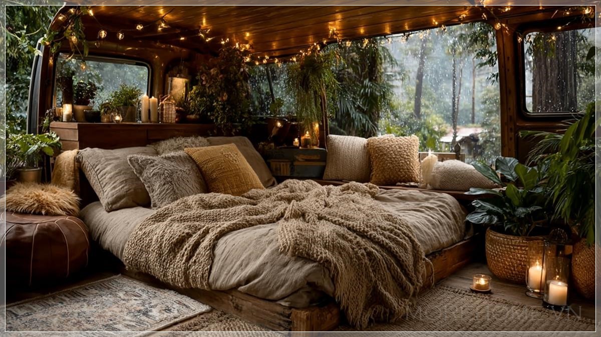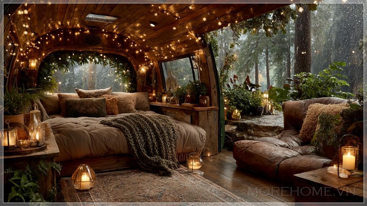Giữa cơn mưa rả rích của khu rừng xung quanh, chiếc xe tải nhỏ trở thành một nơi trú ẩn tuyệt vời, tỏa ra ánh sáng ấm áp từ những dải đèn dây và những ngọn nến lung linh. Bên trong, không gian được trang trí tinh tế với những chiếc gối êm ái, một chiếc chăn dày ấm cúng và những chậu cây xanh mướt, tạo nên một bầu không khí thoải mái, mộc mạc nhưng đầy sức sống.